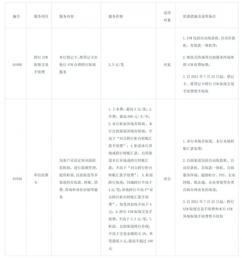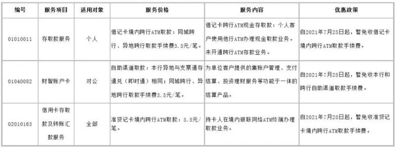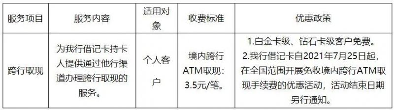 为贯彻国家关于减费让利的号召,落实中国银行业协会和中国支付清算协会共同发布《关于降低自动取款机(ATM)跨行取现手续费的倡议书》中的提议。我行自2021年7月25日起,全国范围内免收借记卡及准贷记卡跨行取现业务手续费,具体包括ATM跨行取现、助农取款及农民工银行卡特色取现服务。