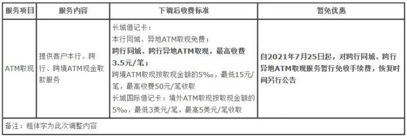 为积极响应中国支付清算协会与中国银行业协会于6月25日联合发布的《关于降低自动取款机(ATM)跨行取现手续费的倡议书》,自2021年7月25日起,我行将对ATM跨行(含同城、异地)取现服务实行减免手续费的优惠措施,具体如下: