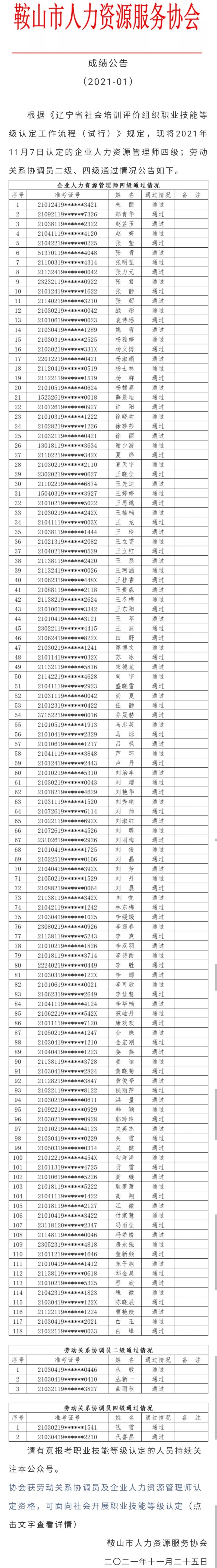 职业技能等级认定考试(2021-01)批次成绩公告